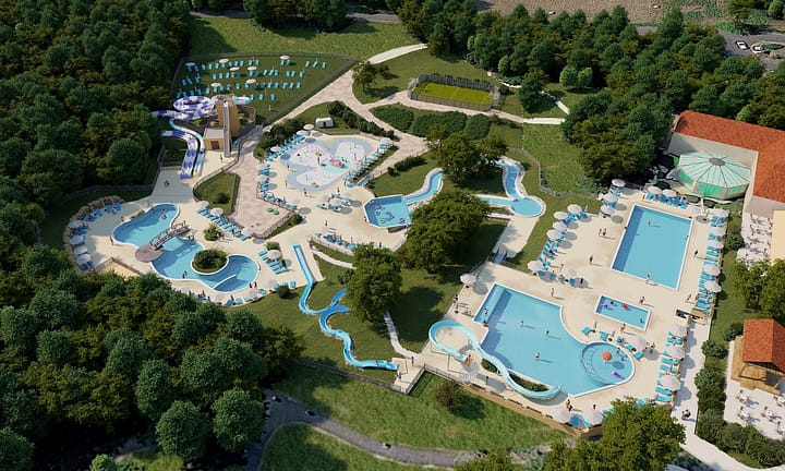 Camping bij Sainte-Alvère, Dordogne in Frankrijk. Geweldig waterpark met spraypark. Zeer veel sport en animatie. Golfen kan hier. Bezoek Le Bugue of Sarlat.
