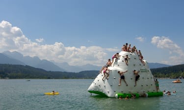 Camping bij Hermagor, Karinthië in Oostenrijk. Direct gelegen aan de Pressegger See. Terrassencamping. Gratis toegang tot zwembad van Schluga camping. Veel faciliteiten en animatie voor jong en oud.