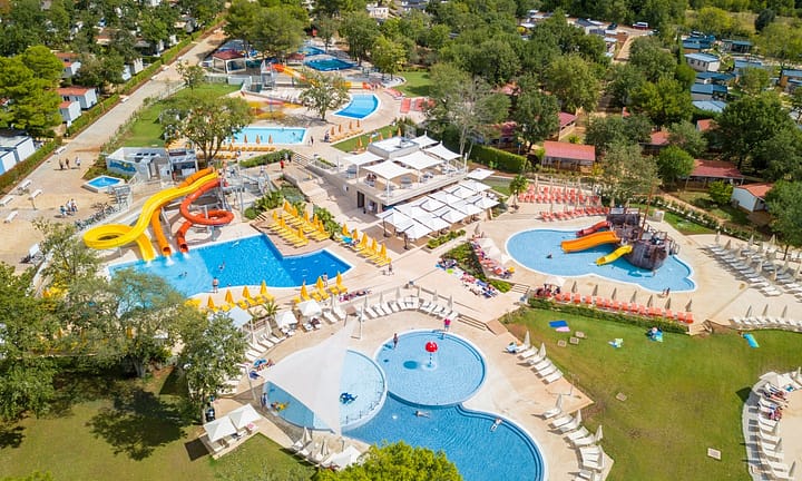 Camping bij Porec, Istrië in Kroatië. Direct aan de Lanterna-baai met zandstrand. Twee grote zwembaden, waarvan 1 aquapark. Veel ‘groen’ op de camping. Al jaren een zeer populaire camping.
