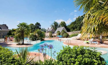 Camping bij St. Cast, Bretagne in Frankrijk. Kasteelcamping op een landgoed. Verwarmd waterpark met glijbanen. Binnenbad met kinderbad en bubbelbad. Sport, knutselen en vissen.