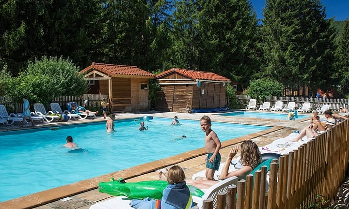 Camping bij , Auvergne in Frankrijk. Mooie familiecamping aan oever van riviertje. Spelen en vissen in riviertje La Dunière. Leuk zwembad. Miniclub, kinderdisco, veel sportactiviteiten.