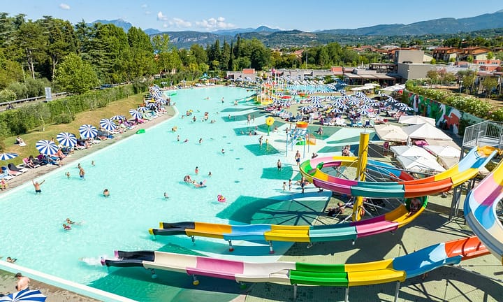 Camping bij Lazise, Gardameer in Italië. Direct gelegen aan het Gardameer met zandstrand. Levendige animatie. 2 zwembaden, 1 met glijbaan (Cisano). Gezellig restaurant.