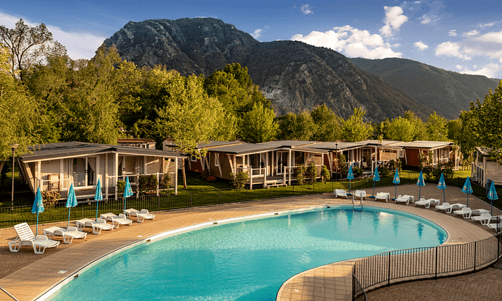 Camping bij , Lago Maggiore in Italië. Exclusief glamping village. Accommodaties bij het zwembad. Zandstrand direct aan Lago Maggiore. Animatie in juli/augustus.