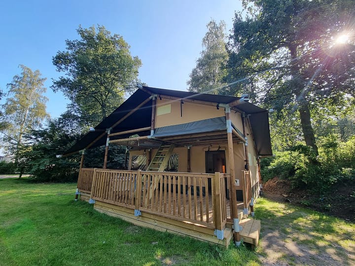 Op Vakantiepark de Sallandshoeve staan onze Villatent Ranger safaritenten, volledig ingericht voor maximaal zes personen. Het unieke design van deze tent zorgt voor een verrassend ruimtelijk effect en open uitstraling. De brede woonkamer met grote ramen en het ruime terras over de gehele breedte van de tent zorgen ervoor dat het hele gezin heerlijk kan genieten van het buitenleven.