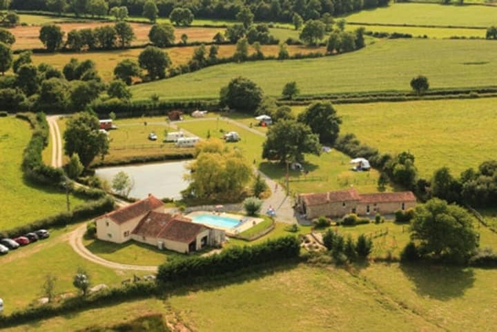 Trakteer uzelf op een verblijf op een naturistencamping in het hart van Nieuw-Aquitanië bij La Ferme Naturiste. Deze ecologische en milieuvriendelijke vakantieplek, genesteld in een betoverende omgeving, nodigt u uit om te kamperen onder de sterrenhemel en de biologische boerderij te ontdekken. Ontspan in het natuurlijke zwembad terwijl u geniet van een authentieke en vriendelijke ervaring met andere reizigers. U kunt ook de regio verkennen die rijk is aan erfgoed en culturele en sportieve activiteiten. Boek nu voor een unieke vakantie die natuur, ecologie en welzijn combineert. Sauna, WiFi, Zwembad, Trampoline, Toilet, Warme douche, Koude douche, Elektriciteit, Telefoon oplaadpunt, RV loosplaats, Huisdieren toegestaan, Regenschuilplaats, Speelplaats voor kinderen, Dieren op het terrein, Parkeren op het terrein, Uitzicht op de velden, Uitzicht op zonsopgang, Uitzicht op zonsondergang, Buiten zitgedeelte, Binnen zitgedeelte, Picknicktafel