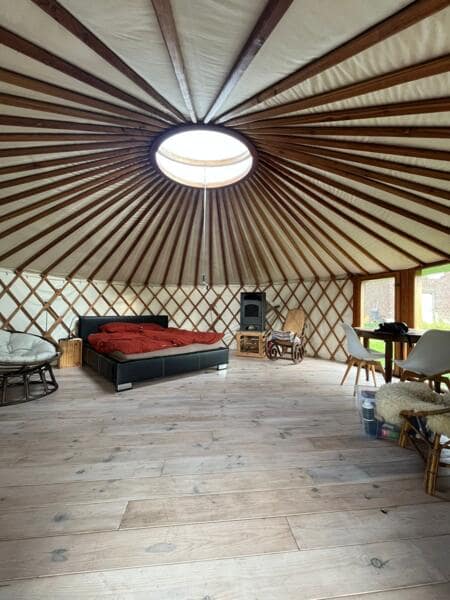 Je verblijft in een “luxe tempel yurt”, gemaakt in Zweden, dus aangepast aan onze temperaturen en extra ruim.