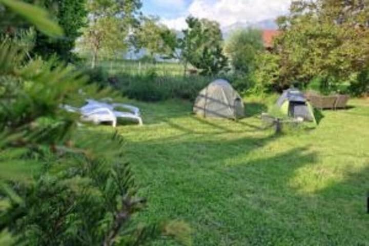 Aan de voet van de Combeloup-berg, in een klein gehucht. De ligging is op het gras, schaduw mogelijk. een kleine heksenhut biedt droge toiletten. Schommels, vuurpot (brandstof niet meegeleverd), jacuzzi (meerprijs op afspraak),… Mogelijkheid tot boogschieten (borg van 10 euro voor elke verloren pijl) Drinkwater, Warm water, Borden en bestek, Vuurkorf, Vuurschaal, Hottub, WiFi, Sfeerverlichting, Toilet, Warme douche, Elektriciteit, Regenschuilplaats, Speelplaats voor kinderen, Uitzicht op de velden, Uitzicht op de heuvels, Uitzicht op de bergen, Buiten zitgedeelte, Picknicktafel, Paarden toegestaan
