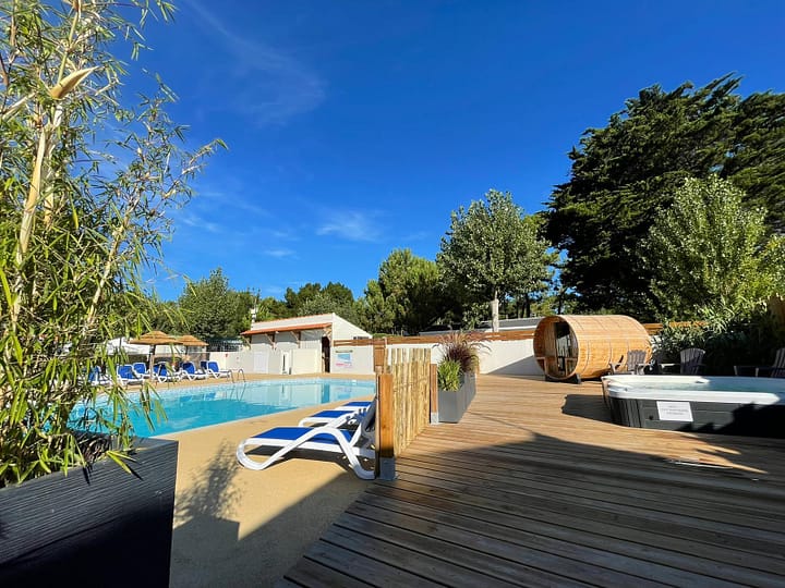 De camping ligt op ca. 900 m van het strand, in een pijnbomenbos. De afgebakende staanplaatsen bieden schaduw, halfschaduw of zon. Er is een verwarmd openluchtzwembad met een apart kleuterbadje. Ook is er een speeltuin, een multisportterrein en een jeu-de-boules baan. Er is een broodautomaat op ca. 100 m van de camping en in het hoogseizoen staan er vier keer per week foodtrucks bij de ingang. De omgeving leent zich voor wandelen en fietsen.