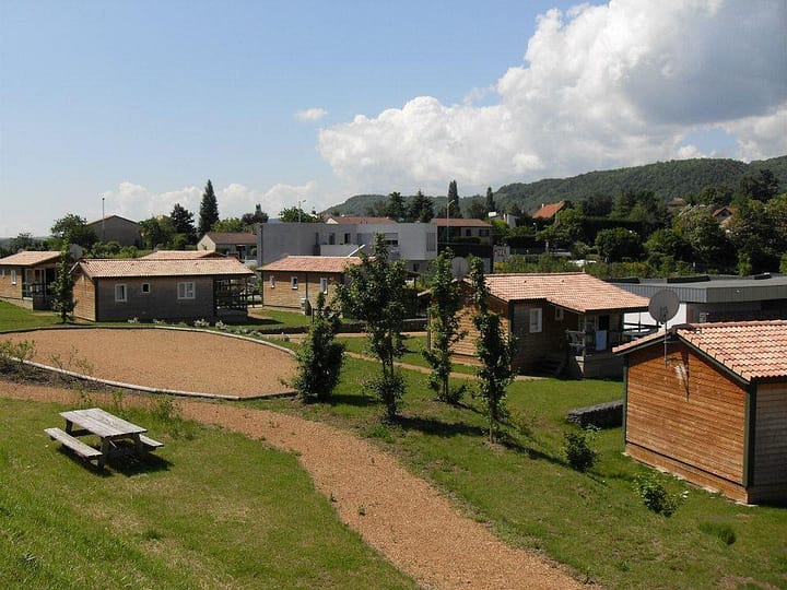 Het glooiende terrein heeft uitzicht op het dorp en op de begroeide heuvels, waar een kasteel zichtbaar is. De meeste staanplaatsen zijn afgebakend door heggetjes en de schaduw is beperkt. De camping heeft een zeer gestructureerde opzet en is omheind met een hoog hekwerk. Groepen jongeren onder de 18 zijn niet toegestaan. De camping ligt bij de fabriek waar Volvic water wordt gebotteld. Deze fabriek is te bezichtigen.