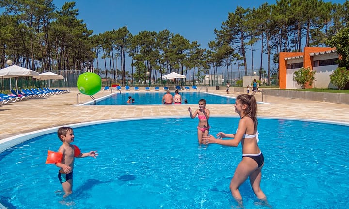 Camping bij , Costa de Prata in Portugal. In een pijnbomenbos. Zwembad met kinderbad. 2 km van zee. Bezoek het mooie Porto.