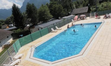 Camping bij , Franse Alpen in Frankrijk. Rustige camping met zwembad, 300 mtr van het meer. Snack met minigolf naast de camping. Fietsverhuur en tennis op loopafstand. Bushalte en fietspad naast de camping.