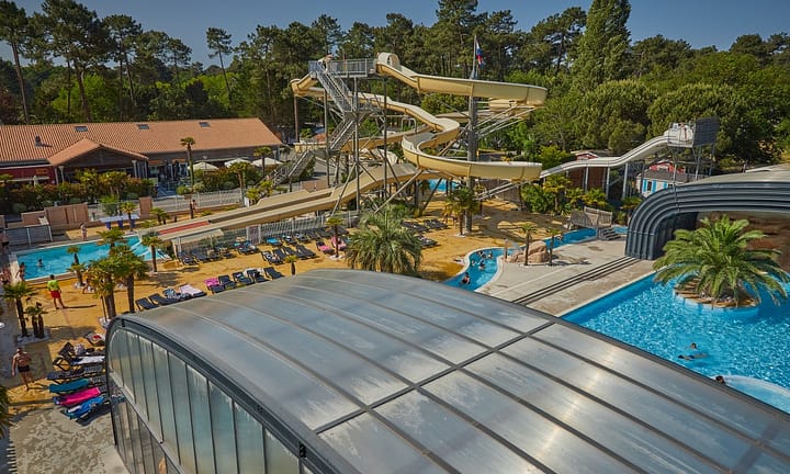 Camping bij La Palmyre, Charente-Maritime in Frankrijk. Mooi gelegen camping in Pijnbomenbos. Zwembadcomplex met 5 glijbanen. Eigen kinderboerderij. Leuk animatieprogramma voor jong en oud.