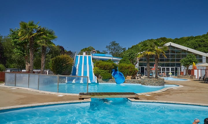 Camping bij Quimperlé, Bretagne in Frankrijk. Overdekt zwemparadijs en buitenbaden. Direct aan de rivier Ellé. Adventure parcours & quad baan. Vlakbij authentiek Bretonse dorpjes.