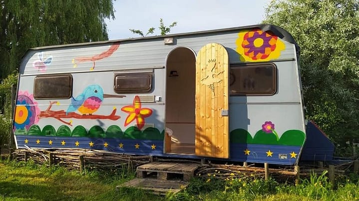 De caravan is uniek en gezellig ingericht, geïnspireerd op het verhaal van Kleine Alice.
