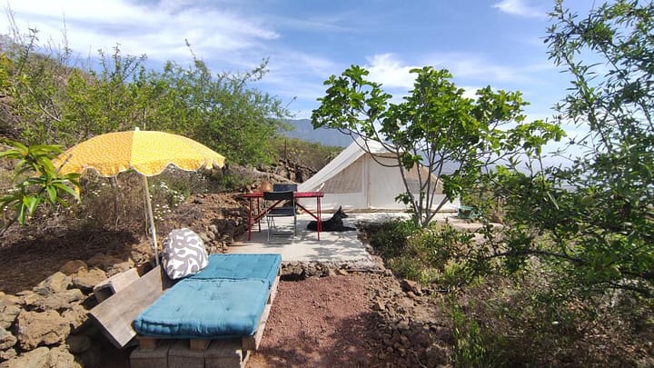 Het betoverende uitzicht op zee, omgeven door bergen en een groene oase, maakt de ligging op een hoogte van circa 400 meter bijzonder. De katoenen tent creëert een prettige sfeer, is 12 vierkante meter groot en is uitgerust met zeer goede matrassen. Een geweldige plek om te ontspannen en voor excursies over het eiland. Het prachtige strand van Puertito ligt op slechts 8 km afstand. Wij hebben veel verschillende soorten fruit en ook onze eigen biologische wijn die u kunt proeven. Drinkwater, Warm water, Afwasbak, WiFi, Hangmat, Sfeerverlichting, Trampoline, Toilet, Warme douche, Koude douche, Huisdieren toegestaan, Speelplaats voor kinderen, Dieren op het terrein, Parkeren op het terrein, Uitzicht op de bergen, Uitzicht op de zee, Uitzicht op zonsopgang, Buiten zitgedeelte, Afvalverwerking, Mobiele ontvangst