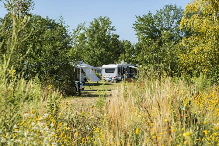 Extra ruime comfortplaats van ca. 140m2, geschikt voor tenten, caravans en campers.