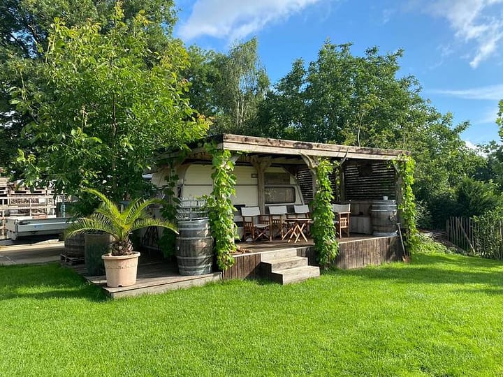 De caravan is een knusse overnachtingsplek voor 2 personen met de mogelijkheid om zelf een maaltijd te koken. De houten veranda voor de caravan is een heerlijke plek om te genieten van het wijdse uitzicht over de groene binnenweiden van het dorp Valmeer.