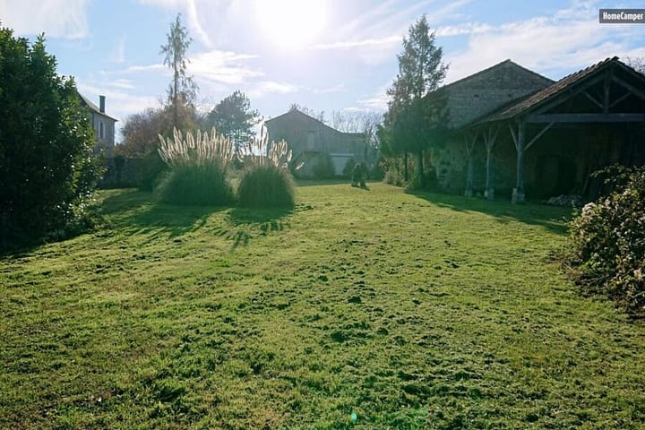 Saint-Ouen-la-Thène Kamperen op een permacultuurboerderij in een ommuurde tuin, Nouvelle-Aquitaine