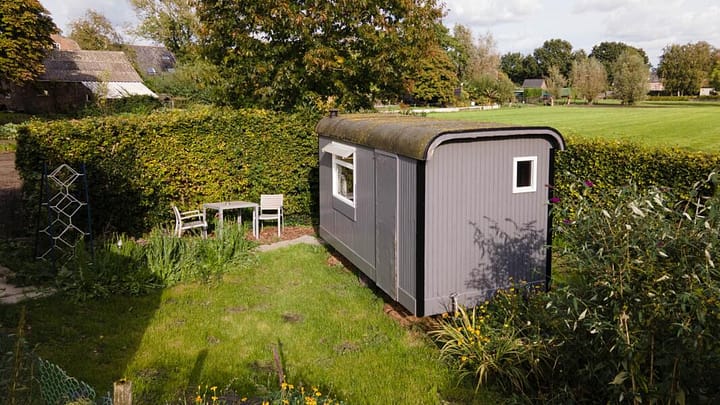 Deze met liefde ingerichte wagen staat aan de rand van een prachtige biologische pluktuin. Je loopt zo de natuur in. Het is een mooi plekje in een privé tuintje. Nieuw sanitair en keukentje op een paar meter afstand. Deze zijn in juli en augustus heel soms gedeeld met één echtpaar.