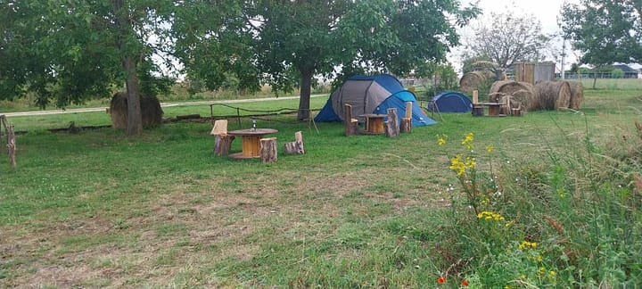 Je kampeert binnen onze educatieve boerderij in een opstelling met of zonder tent (huurtenten opgezet beschikbaar voor 4 plaatsen of 2-3 plaatsen. Tent voor € 7 en € 10 op je staanplaats en daarna € 3 per dag) of opgezet uw bestelwagen, camper of caravan. Je zult prachtige zonsopgangen en zonsondergangen kunnen bewonderen en je hebt toegang tot onze reeds aanwezige paarden-, schapen- en geitenparken. Je hebt een gebied waar we wilde bloemen bewaren voor het welzijn van de natuur en het plezier van je ogen! Je kunt er zelfs boeketten van maken zoals je wilt! De meeste van onze apparatuur, zonnedouches en droogtoiletten zijn gemaakt van gerecyclede materialen. Gratis telefoon opladen. Elektriciteit bij u op locatie voor € 2,- per dag. Ontbijt met 1 ambachtelijk gebak, ambachtelijk brood, boter en/of jam en/of lokale honing, koffie, thee of chocolade geleverd van 7.00 tot 10.00 uur. Onze boerderij ligt aan de poorten van het Regionaal Natuurpark Loire-Anjou-Touraine, waar u tal van culturele of natuurexcursies, fietsroutes, ruiterroutes, wandelroutes, kelderbezoeken vindt… we zijn op een paar honderd meter afstand van de eerste kelders van Saint Nicolas de Bourgueil bijvoorbeeld en zo’n vijftien kilometer van Saumur. De stad van ons dorp op 1 km afstand biedt alle voorzieningen met 1 supermarkt, 1 apotheek, 2 bakkerijen, een slagerij-delicatessenzaak, 1 bar, 1 bar-restaurant, 1 postkantoor, een krantenwinkel… En onze stad heeft zojuist het gloednieuwe bosrecreatiecentrum “Les cimes de Courcy” ingehuldigd
