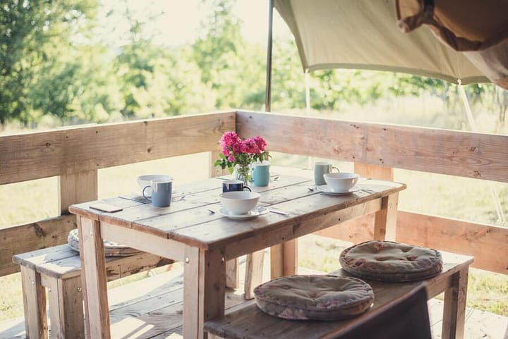 Drinkwater, Warm water, Gasfornuis, Afwasbak, Keuken, Basis kookmaterialen, Borden en bestek, Eettafel, Zwemvijver of rivier, Toilet, Warme douche, Koude douche, Elektriciteit, Telefoon oplaadpunt, RV elektriciteitsaansluiting, Huisdieren toegestaan, Overdekte keuken, Speelplaats voor kinderen, Dieren op het terrein, Parkeren op het terrein, Uitzicht op de velden, Uitzicht op de heuvels, Uitzicht op het bos, Uitzicht op zonsopgang, Uitzicht op zonsondergang, Buiten zitgedeelte, Picknicktafel
