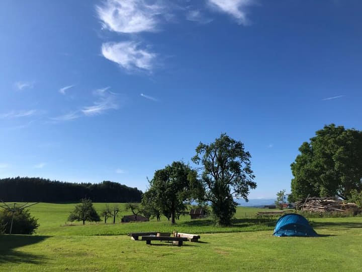 Onze boerderijcamping ligt midden in de Allgäu en biedt alles wat een natuurliefhebber met caravan of busje zich maar kan wensen. Elektriciteit en drinkwater zijn aanwezig. Omdat onze melkveehouderij fulltime wordt gerund, hebben u en uw kinderen ook de mogelijkheid om de landbouw van dichtbij en op zijn best te ervaren. Op ontdekkingsreis tussen München en het Bodenmeer Op onze boerderij kunt u zelf beslissen of u wilt ontspannen tussen de fruitbomen en wilt genieten van het vrije uitzicht op de bergen, of dat u liever gebruik maakt van het brede aanbod aan vrijetijds- en lokale recreatiemogelijkheden in de directe omgeving. Onze boerderij ligt dicht bij twee dorpen en is het perfecte startpunt om de Allgäu te ontdekken. We kijken uit naar je bezoek!