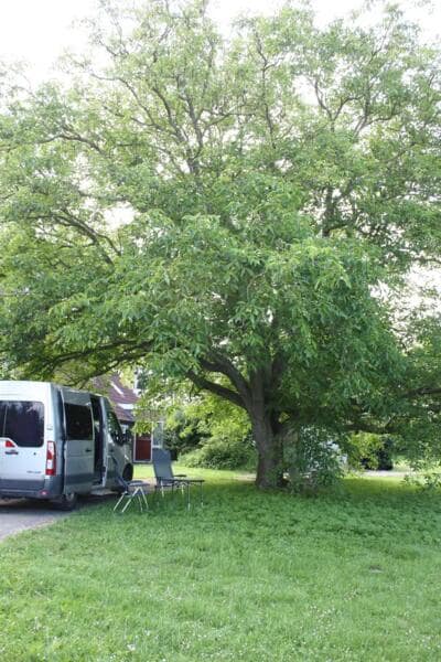 Met uitzicht over de walnootboomgaard en de groene grasweilanden sta je onder de walnootboom ( hoogte normale hoge camperbus) Je kan electra (6amp) afnemen en kun je je watertank bijvullen. Er is ook Wifi beschikbaar. Er is een kleine hout gestookte sauna op het erf en je kan een kano lenen om langs de eilandjes in de IJsseldelta te varen. Al met al een oase aan rust.