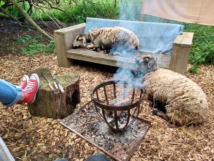 Achter op het weiland vind je de hut met daarin een fijn bed met klamboe, een zithoekje met houtkachel en een gedeelte is slaapplek voor de schapen. Ook is er een toilet, die je wel handmatig moet doorspoelen; lekker basic dus. Ik zorg tevens voor 40 liter vers kraanwater voor de gasten; is het op dan breng ik meer. Er is geen electriciteit, maar wel verlichting op batterijen/zonnecel. Er liggen wandel-/fietsroutes en enkele tijdschriften en boeken. Er zijn borden, mokken, glazen, bestek, pannen en theedoeken. Er is een 1-pits gasstelletje. Koken kan ook op de BBQ. Verder is er een snoerloos koelkastje, waar ik een groot bevroren koelelement in leg en … een paar koude biertjes. Je hoeft dus alleen je eigen slaapzak mee te brengen. Ook is er op het weilandje een kikkerpoel en via een loopbruggetje kom je in een stuk bos. Mensen noemen het een paradijsje.