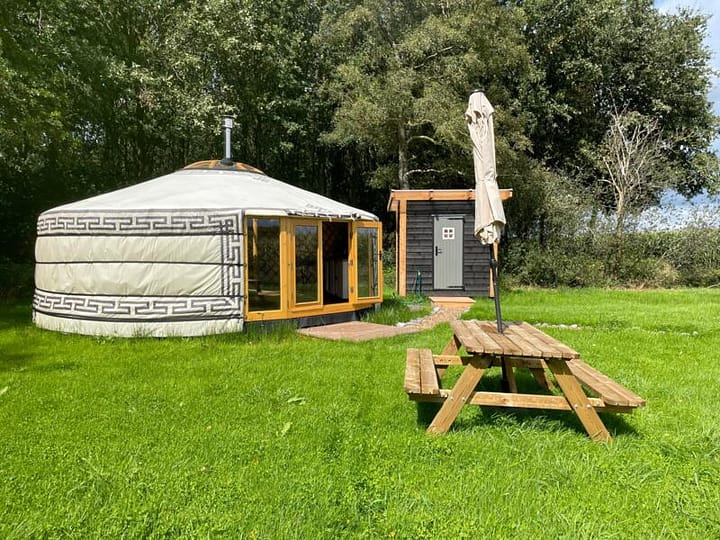 De yurt bevindt zich vlakbij het drie provincie punt, hierdoor ben je snel in Drenthe, Friesland of Groningen. Er is uitzicht op het bos, de landerijen en het erf van de eigenaar. Doordat het achter op het erf ligt, genieten de gasten van welverdiende rust en privacy.
