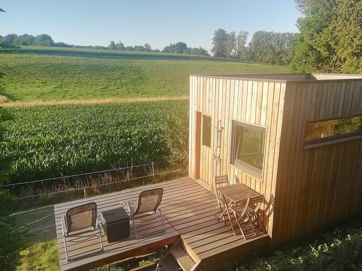 Ontdek een oase van rust, op slechts 10 minuten van Brussel. Dompel jezelf onder in een unieke ervaring door te ontspannen in onze hut op palen, genesteld in het hart van weelderige groene velden, weg van indiscrete ogen. Bewonder de natuur en dieren vanuit uw bed, dankzij een groot raam, of vanaf de ligstoelen op uw privéterras. Uw ontspanning bereikt zijn hoogtepunt met het gebruik van de privésauna. Verleng uw zintuiglijke ervaring met de buitendouche. De toegang tot de hut, gelegen onder de tuin, is volledig onafhankelijk. Het is volledig privé voor de huurder, zonder inkijk. De douche is buiten. Deze is voorzien van een warm/koud mengkraan en een scherm aanwezig voor wie dat wenst. De cabine is voorzien van een sauna (€35 extra), droogtoiletten, verwarming en een kantoorruimte met WIFI/Ethernet/scherm. Er is geen televisie. Het bed, een comfortabele slaapbank, kan achterover leunen zodat de inzittenden van het uitzicht kunnen genieten terwijl ze in bed blijven liggen. Omdat hij niet breed is, is hij ideaal voor 1 persoon of 2 personen die het niet erg vinden om dicht bij elkaar te slapen. Ontbijt mogelijk op aanvraag (€12 pp). Wandel-/fietspaden vanuit de hut. Restaurants en winkels in de buurt. Het Meer van Genval, Château de La Hulpe/Zonenwoud, Brussel (Oudergem) en de luchthaven (BRU) liggen op 10/15 minuten rijden met de auto.