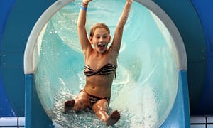 Camping bij Toreilles Plage, Languedoc-Roussillon in Frankrijk. Supergrote glijbanen in het zwembad. Dichtbij het strand. In rustige badplaats. Veel Franse campinggasten.