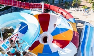Camping bij , Languedoc-Roussillon in Frankrijk. Waterpark met mooie glijbanen. Op korte afstand van de mooie, lange zandstranden. Bar en snackbar. Gelegen in een uitdagende regio.