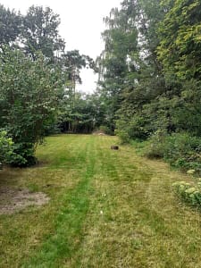 Grote tuin met bomen op het Vlaamse platteland. 3 Ouessant-schapen en kippen houden je gezelschap