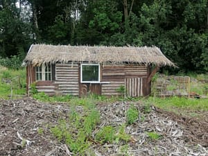 Zelf gebouwde houten hut ( 17 m2 binnenruimte en 8.5 m2 terras) aan de rand van een klein bos. De hut is gelegen in onze grote tuin waar de privacy gegarandeerd wordt. Het is zeer...