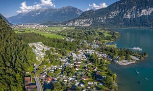 Camping bij Interlaken, Berner-Oberland in Zwitserland. Aan het Thunermeer met eigen zandstrand. Veel watersportmogelijkheden. Gratis toegang tot buitenzwembad in Interlaken....