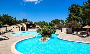 Camping bij , Corsica in Frankrijk. Vakantie op een camping vlakbij zee. Verwarmd zwembad met jacuzzi. Gratis fitnessruimte. Porto Vecchio en Bonifacio.