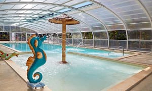 Camping bij , Bretagne in Frankrijk. Verwarmd zwembadcomplex. Wellnesscentrum. Vlakbij lange zandstranden. Doe mee met de aquarobics en zwem u fit.