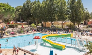 Camping bij , Languedoc-Roussillon in Frankrijk. Verwarmd zwembad met glijbanen. 800 meter van strand en zee. Animatie in hoogseizoen. Voetbal, volleybal, of huur een fiets.