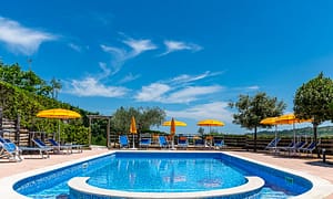Camping bij , Le Marche in Italië. Klein maar fijn zwembad met ligbedden. 5 minuten van het strand van Cupra Marittima. Groene camping met prachtige uitzichten. Authentieke...