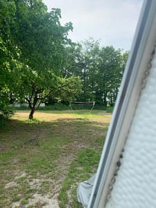 De plaats voor de tent is goed beschut in de schaduw van 2 grote lindebomen. In de vuurschaal mag ook een klein vuurtje gemaakt worden en kunnen de drinkwaterflessen gevuld...