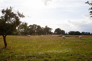 RP Kaiserslautern Grote tuin met schapen en kippen aan de bosrand in Kaiserslautern