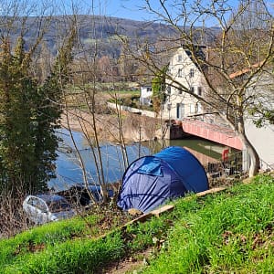 Gezellig bosperceel van 3000 m² met beek, water, open haard en toilet Midden in de natuur, omgeven door hoge bomen, wacht u een kampvuurplaats met zitgelegenheid en uitzicht op...