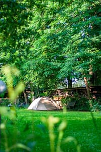 FR Tjalleberd Kamperen tussen de bomen in Friesland, met vrij uitzicht.