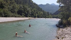 De staanplaatsen op deze langgerekte camping liggen op kleine veldjes tussen de rivier en de beboste berghelling. Loofbomen zorgen voor voldoende schaduw. Op het terrein zijn...