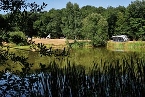 Naturistencamping grenzend aan een bos. De plaatsen liggen aan de randen van de velden, tegen de bosrand en onder bomen. Op een van de velden ligt een vismeer met ligweide. Het...