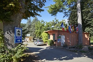 Je vindt de langgerekte groene camping met toeristische staanplaatsen op gras gegroepeerd op het rechterdeel van het terrein. Ze liggen aan rechte straatjes gescheiden door hoge...