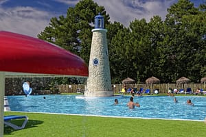 Op de parkachtige camping liggen de staanplaatsen op gras en worden afgebakend door heggen en bomen. Het zwemparadijs met kleuterbad, met bruggetjes, kanaaltjes en glijbanen ligt...
