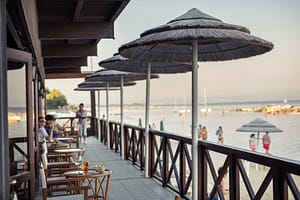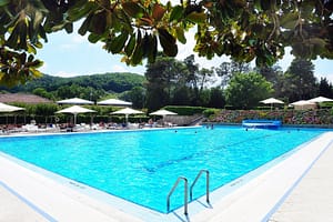 Familiecamping aan de Itaiaanse kust. Tussen de staanplaatsen staan gevarieerde loofbomen. Het terras bij het restaurant kijkt op het Olympisch bad, met startblokken en acht...