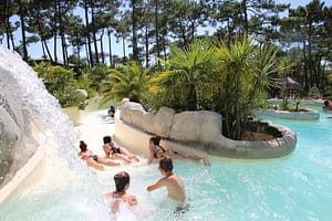 Camping in een duingebied naast het dorp Lacanau-Ocean, hét surfersparadijs van Frankrijk. De plaatsen zijn door heggen afgebakend. Vanuit de bar-restaurant kijk je naar de...