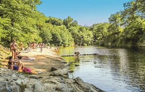 De vlakke en schaduwrijke camping ligt aan de voet van de rivier de Ardèche, die hier een behoorlijke stroming heeft. De toeristische staanplaatsen zijn gelegen op een grasveld...